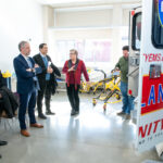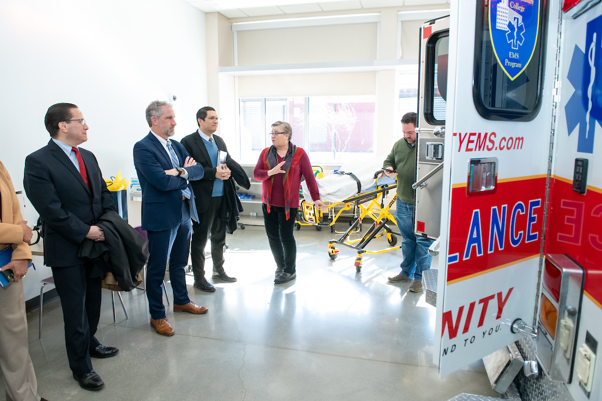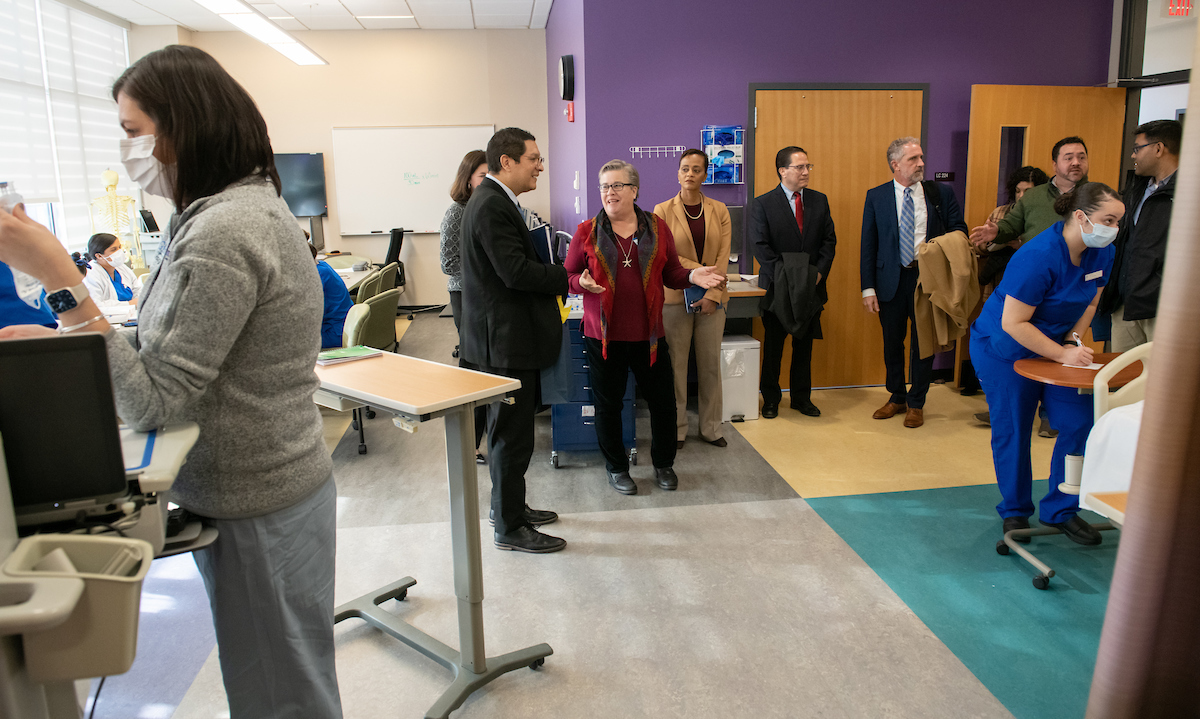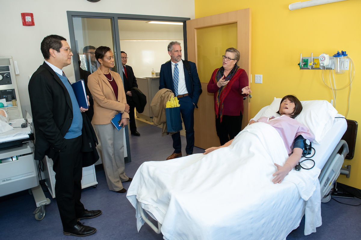 Interim Dean of Health Services Kathy Hudson then led Ortega and a small group on a tour of the classrooms and labs in the El Hefni building. Stops included the maternity simulation room, with blinking and breathing mother and child teaching mannequins, and the fully operational ambulance embedded in the building’s first floor.