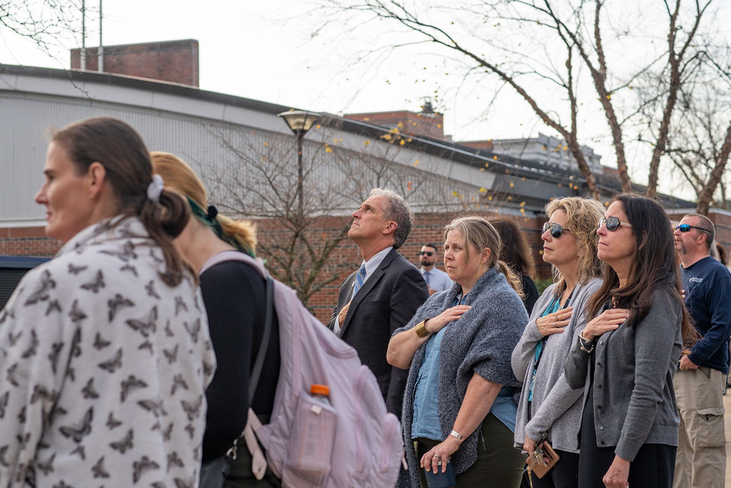 Haverhill, MA (November 7, 2024) – Uncharacteristically warm weather provided a perfect backdrop as Northern Essex Community College faculty, staff, and students gathered on the Haverhill Campus to honor the bravery and sacrifice of the nation’s veterans. The college’s Veterans and Military Services Department marked the Veterans Day holiday with a moving flag-raising ceremony and breakfast. The event featured a raising of the American and POW/MIA flags by local veterans, the national anthem sung by NECC student Sean Gaff and Taps played on the trumpet by student Joni Silva.