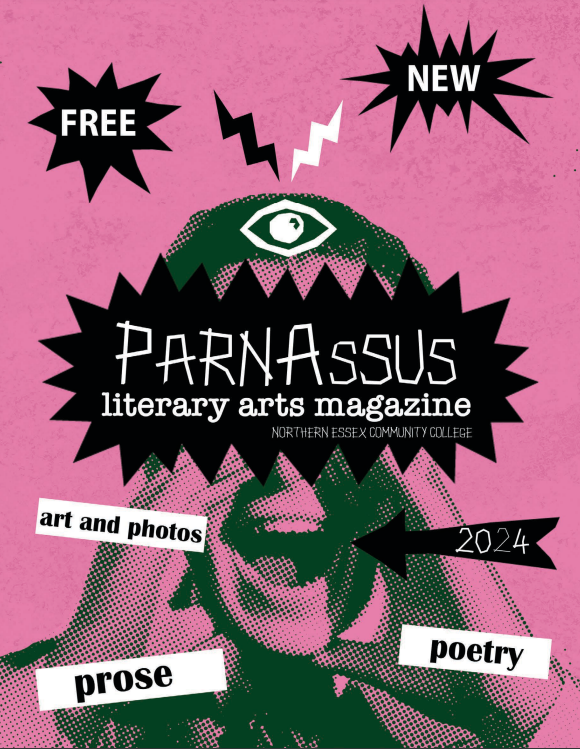 “I’m so proud to be able to offer a national platform of recognition for the amazing work that our NECC community creates,” said NECC Writing Program Coordinator/ Faculty Advisor for Parnassus Patrick Lochelt. “It’s a huge benefit for students to help bolster their experience and resumes/portfolios for those wishing to go onto careers in creative fields and to add ‘feathers to their caps’ in ways they might not be able to otherwise.” cover of latest edition of magazine, black lettering on hot pink background