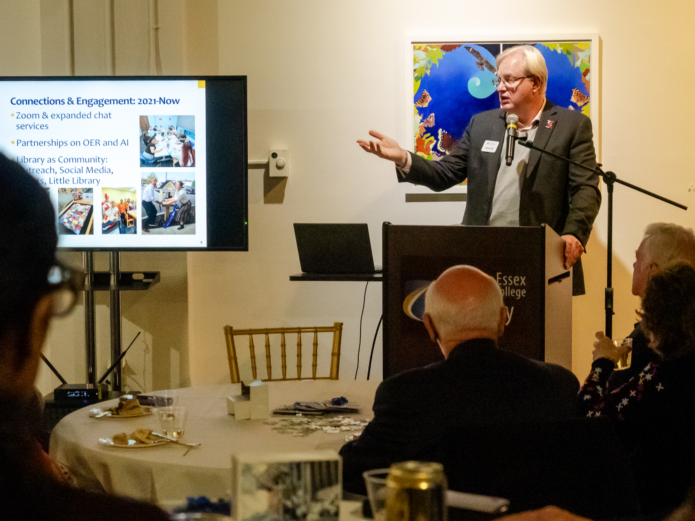 The main program welcomed new Assistant Dean and Lead Library Administrator Matthew Bodie to the podium for a lecture and discussion on the history of NECC’s campus library culture, during which he explored the library’s evolution from a small collection of shelves in 1961 to a dynamic academic hub in 2025, complete with lab spaces, an art gallery, literacy labs, and access to digital scholarship repositories. Chris Dube, an NECC student and frequent library user, followed with a brief testimonial about his experience with the library and the ways in which it had positively contributed to his academic journey.