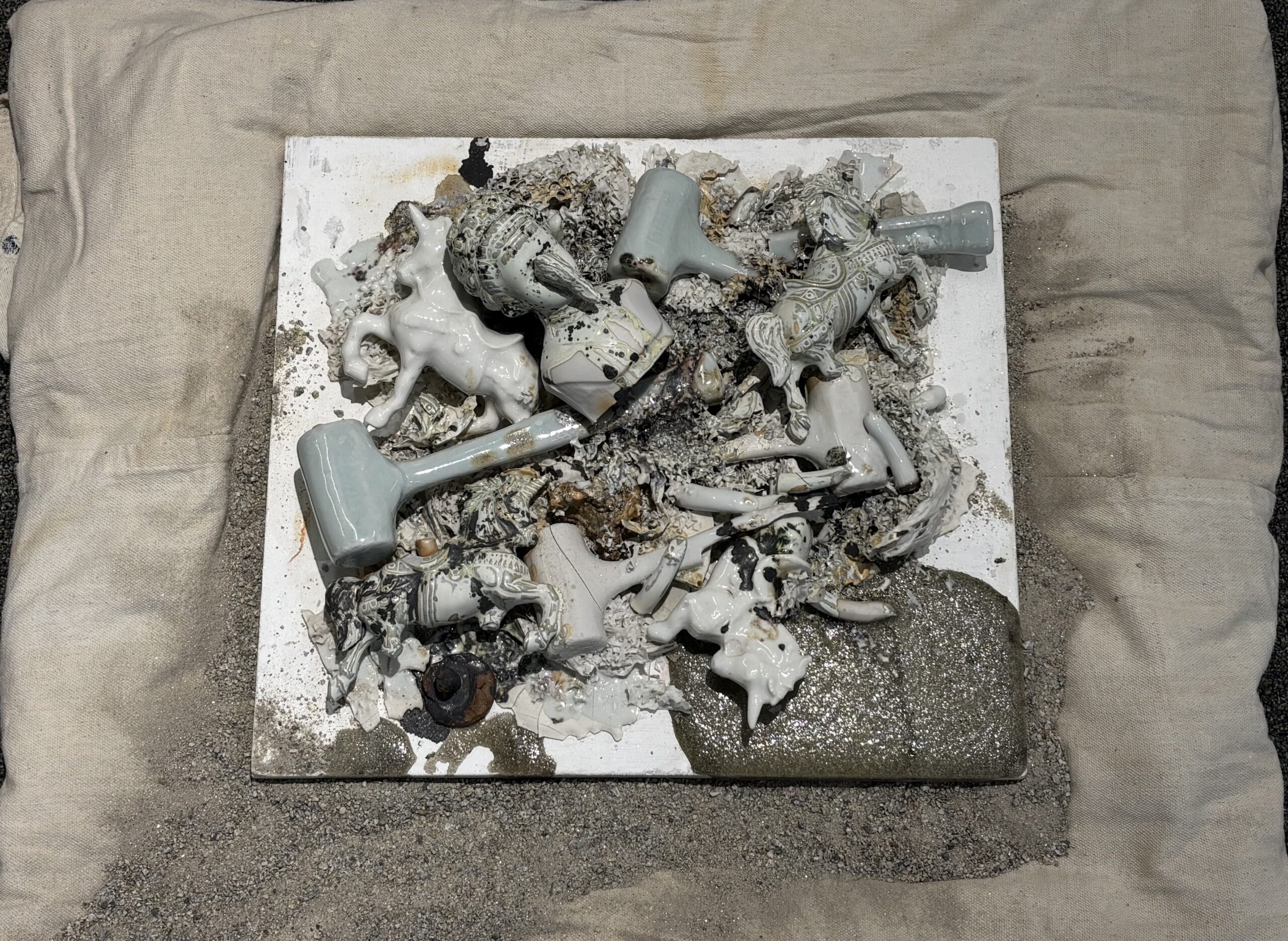 Working with fragments of the everyday – newsprint, metal, broken ceramics, organic materials – the artist gathers what is forgotten, allowing each object to shift, not back into what it was, but toward what it might become, extending its story rather than ending it.